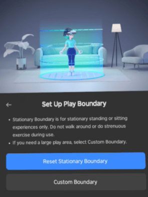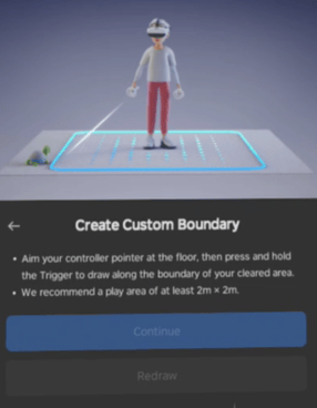 Each time you put on the headset, the passthrough cameras activate, allowing you to see your surroundings, and you are prompted to choose a boundary type. Enter VR in Current Boundary or choose Reset Stationary Boundary to set up your stationary boundary, or Custom to draw your own boundary. Strivr recommends drawing a custom boundary. When setting a custom boundary, you’ll first set the virtual ground by touching the ground with the controller, then draw a boundary on the floor with the controller, then confirm.